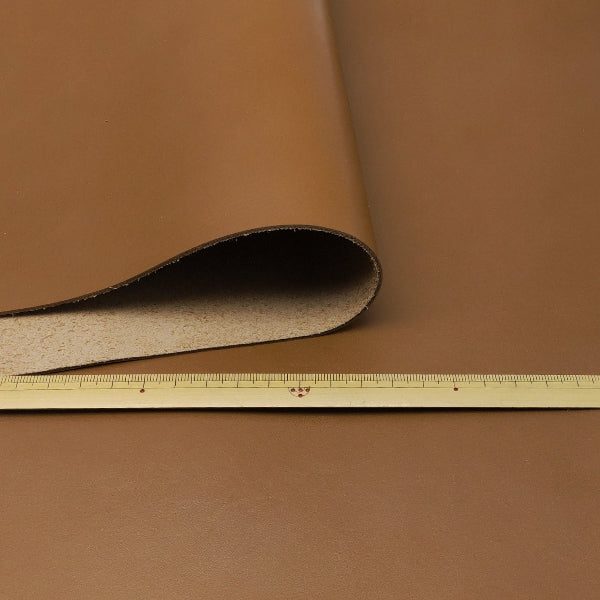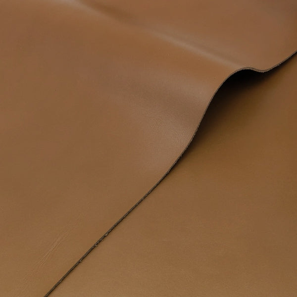 ・適度なコシのある鞣しの牛革です。フラットな表面ですが、部位によっては革本来の細かなシワやトラ目などを楽しむことができる革です。カラーはライトブラウン、光沢はやや弱めの半ツヤ仕上げです