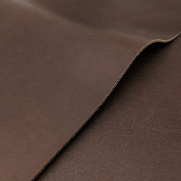 ・しっかり締まったコシのある硬めの牛ヌメ革です。芯通し染色後、表面をアニリン系調色で透明感のある均一なカラーにしています。フラットな表面仕上げですが、部位によっては血筋やトラ目など革本来の表情も楽しむことができます。カラーはチョコブラウン、半ツヤ仕上げです