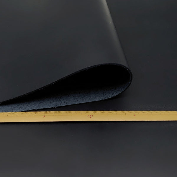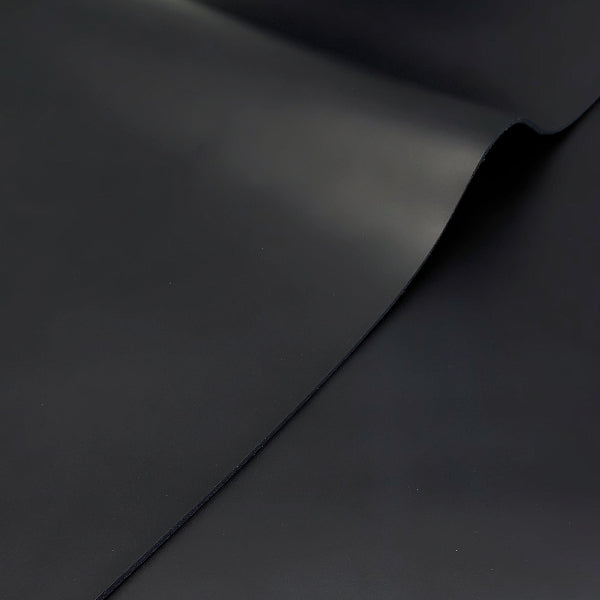 ・しっかりコシのある締まった鞣しの牛革です。半ツヤ仕上げの芯通し染色革で、フラットで均一な表面仕上げです。カラーはディープネイビー(ブラックに近い極めて濃いネイビー)です