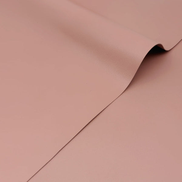 ・極薄にスキ加工を施した、適度なコシのある牛革です。芯通し染色後、表面を均一な色に調色しています。フラットな表面仕上げですが、部位によっては細かなシワなど革本来の表情を楽しむこともできます。カラーはベビーピンク、光沢は半ツヤ仕上げです