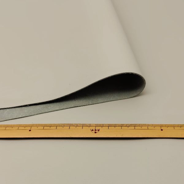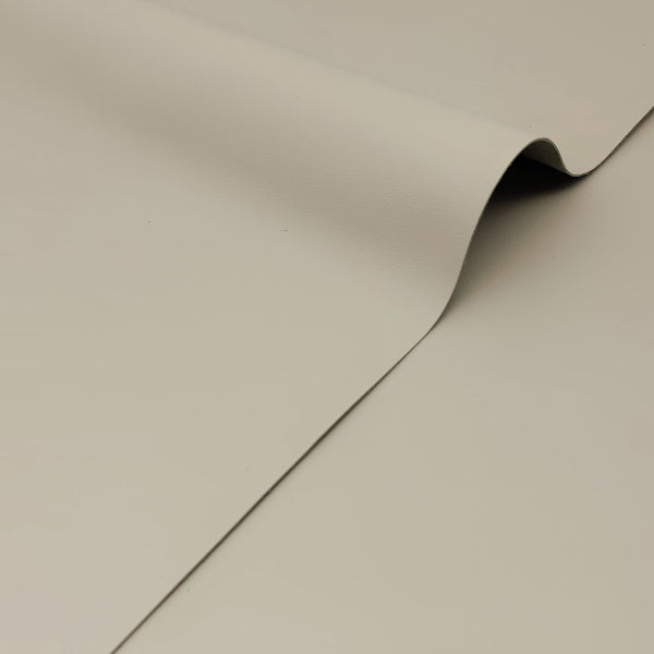 ・薄くスキ加工を施した、適度なコシのある牛革です。芯通し染色後、表面を均一な色に調色しています。フラットな表面仕上げですが、部位によっては細かなシワなど革本来の表情を楽しむこともできます。カラーはペールグレー、光沢を抑えたマット調仕上げです