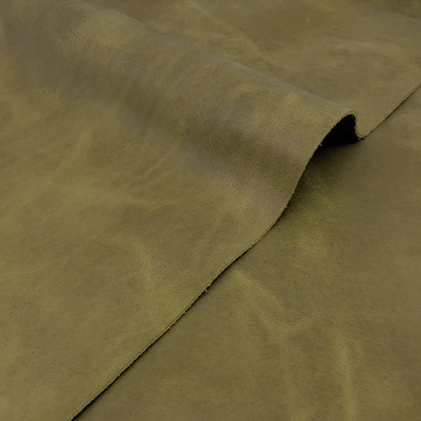 ・オイルが浸透しているため、プルアップ仕上げの色濃淡が現れます(革を山折りすると油分が移動して色が薄くなり、革を押したり揉んだりすると移動した油分が元に戻ります)カラーはウィローグリーン(柳葉色とも呼ばれる、落ち着いた黄緑色)、半ツヤ仕上げです