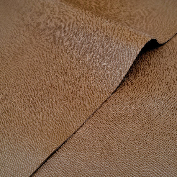 ・しっかり締まった鞣しの芯通し染色牛革です。表面にシボ加工を施すことで使用後の細かなキズが目立ちにくくなります。カラーはブラウン、光沢はやや弱めの半ツヤ仕上げです