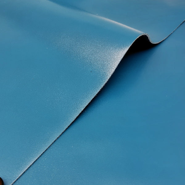 ・しっかりコシとハリのある牛革です。芯通し染色の後、表面を顔料系調色で均一なカラーに仕上げています。カラーはセルリアンブルー。フラットな表面仕上げで光沢はやや強めです