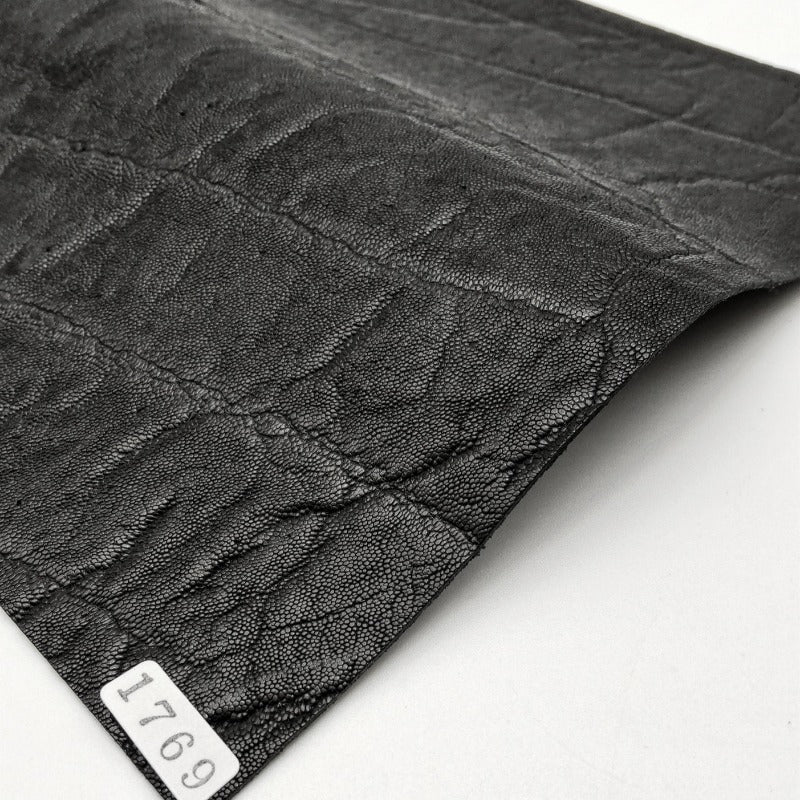・ゾウ革の特徴は、細かい粒状に隆起した銀面です。ゾウは体が大きいので部位によって模様や質感が異なります